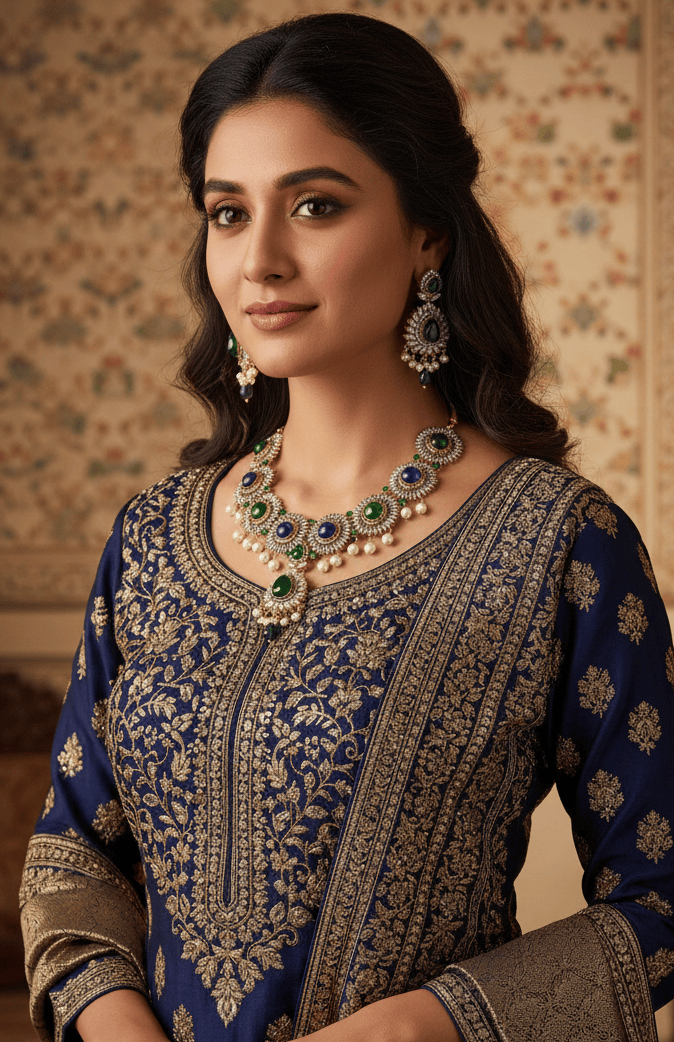 A Kundan set is a type of jewelry that is very popular in India. It is made using a special technique where colorful gemstones are set in gold or a gold-like metal. The stones are usually arranged in beautiful patterns, making the jewelry look very elegant and traditional. Kundan jewelry often includes necklaces, earrings, and rings, and it is commonly worn during weddings and festivals. The bright colors and shiny stones make Kundan sets a favorite choice for many people who want to add a touch of sparkle to their outfits.