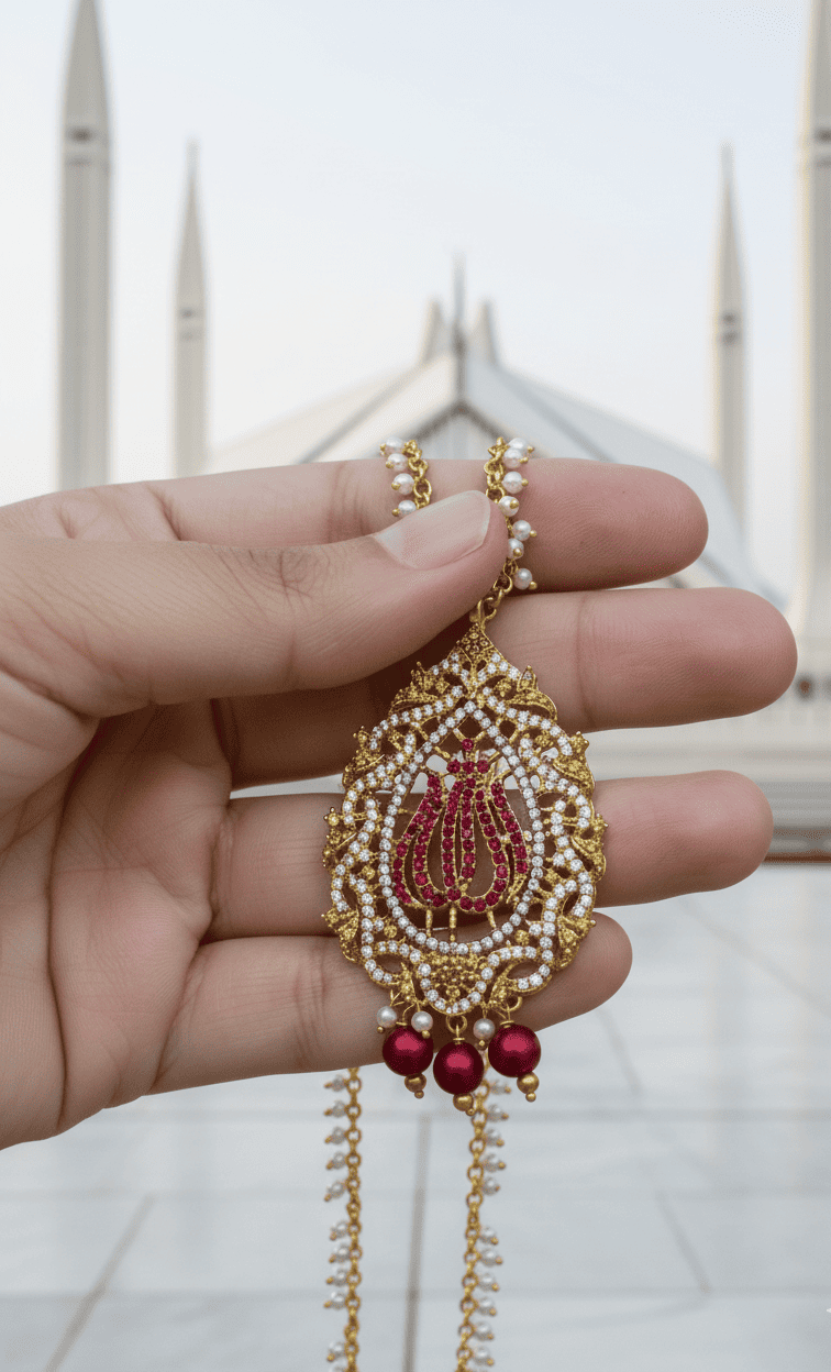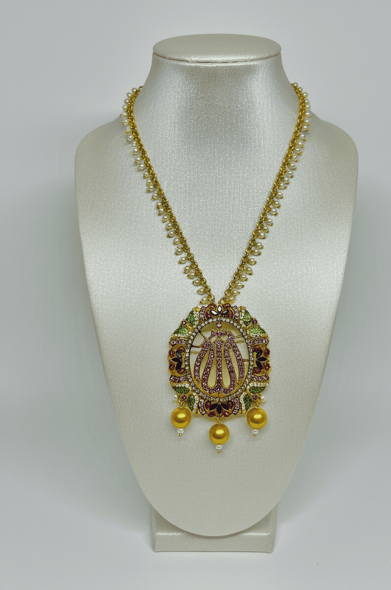 Stunning cubic zircon embedded Big Size ALLAH name pendant with golden chain. This handmade calligraph pendant is exclusively made for you to