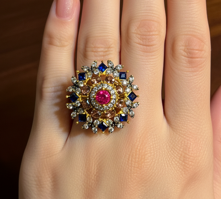 This stunning floral ring features a captivating blend of ruby, sapphire, and champagne-toned stones, perfectly set in radiant gold. The central red gem brings a pop of passion, while the surrounding brilliance creates a regal, timeless charm. Whether for a wedding, celebration, or a touch of everyday elegance, this piece embodies luxury and sophistication.